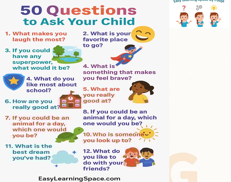 In this blog post, you’ll find 50 simple, age-appropriate questions you can ask your child — from toddlers to teens — to help them open up and share their thoughts and feelings with you. Use them at bedtime, during car rides, at the dinner table, or anytime you want to strengthen your bond.